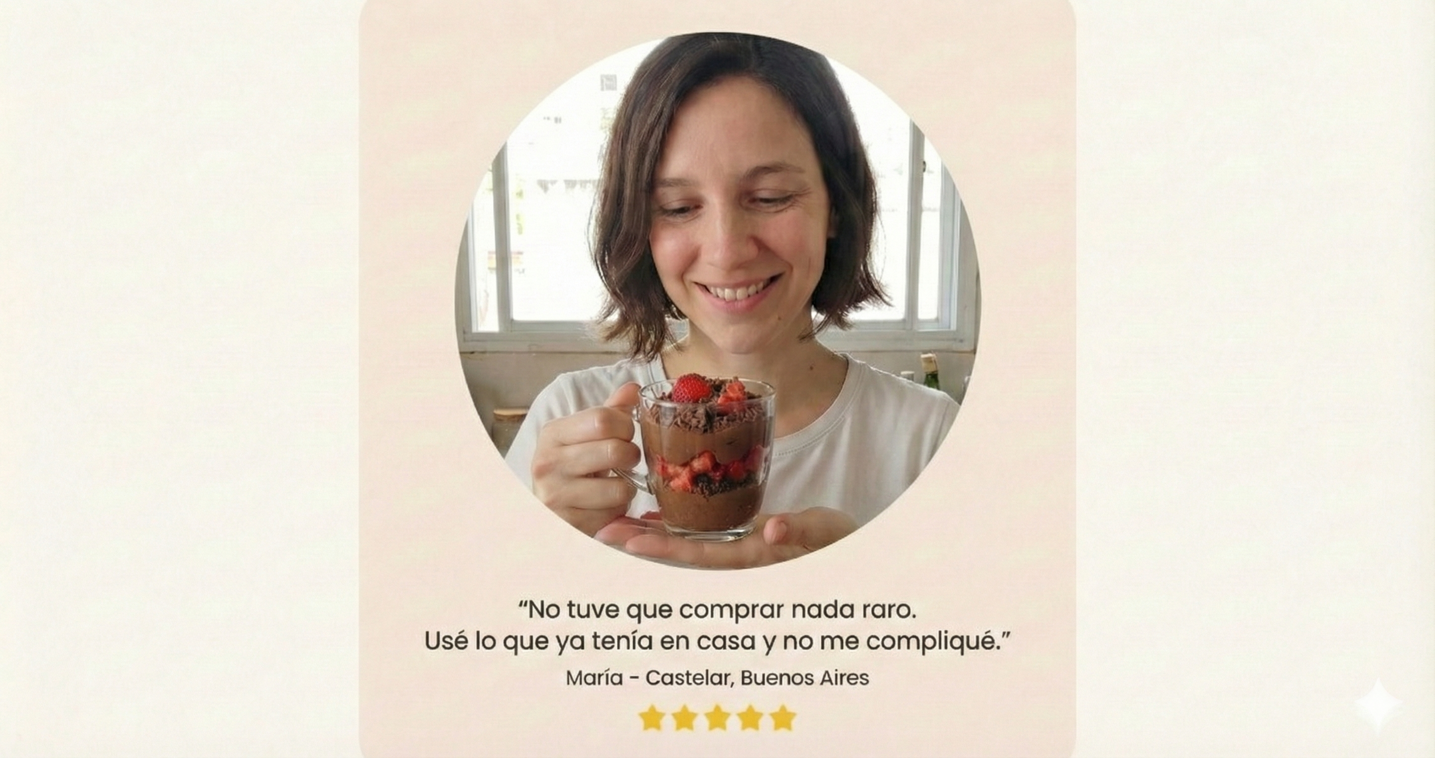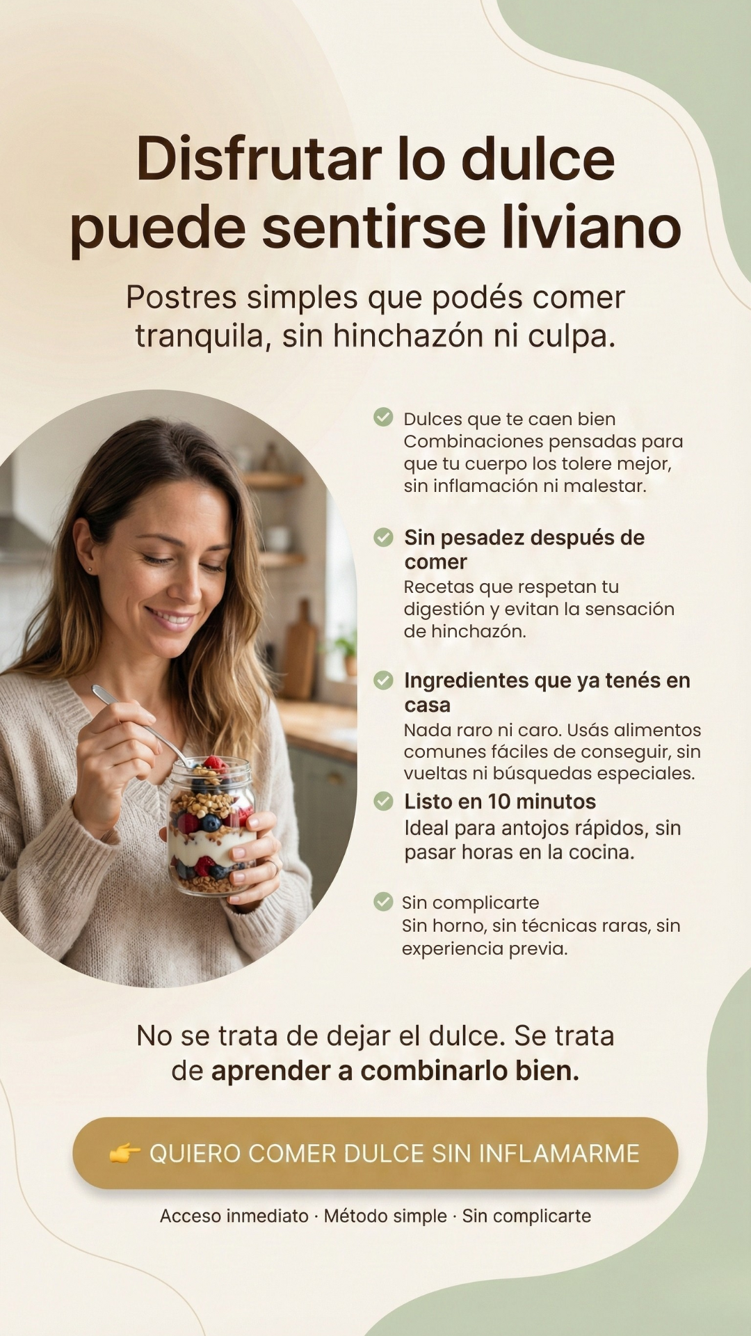 Vas a recibir acceso inmediato a una guía digital con un método simple y paso a paso para comer dulce sin inflamarte,